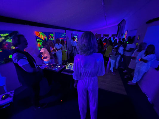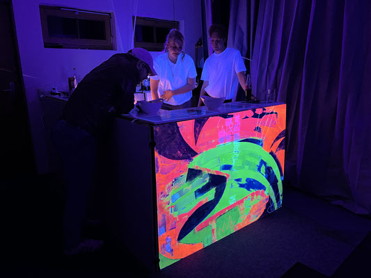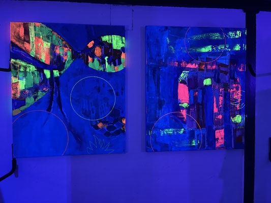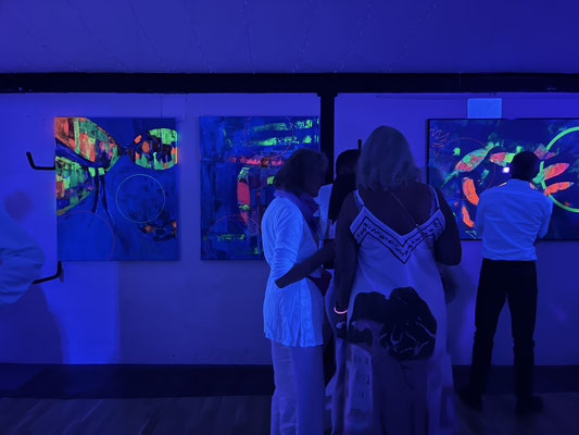 Kunst wird bei diesem Shining Art Event neu inszeniert und erlebbar gemacht. Mit Neonlicht und Farben mit fluoreszierendem Pigment leuchten die Bilder aus sich heraus. Die Werke sind keine digitale Projektionen, sondern auf Karton und Leinwand gemalte, überwiegend großformatige Meereskreationen, die zu einer spannenden Reise in die Unterwasserwelt einladen – mit zahlreichen Details, die es zu entdecken gibt und einer Tiefe, die von der Meeresfarbe Blau und vielen Dimensionen getragen wird.
