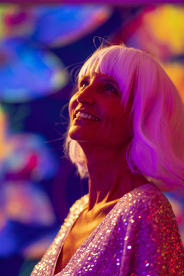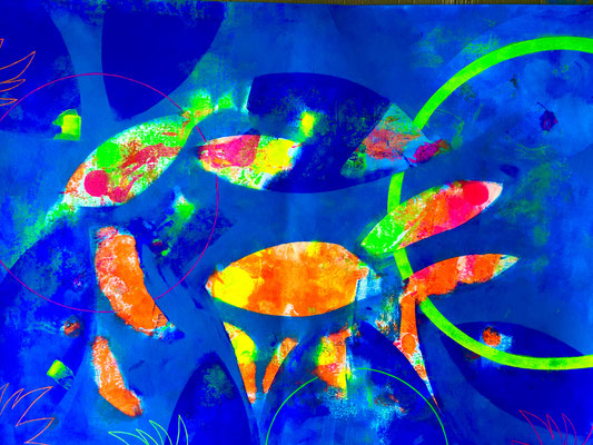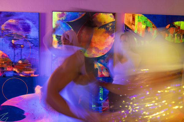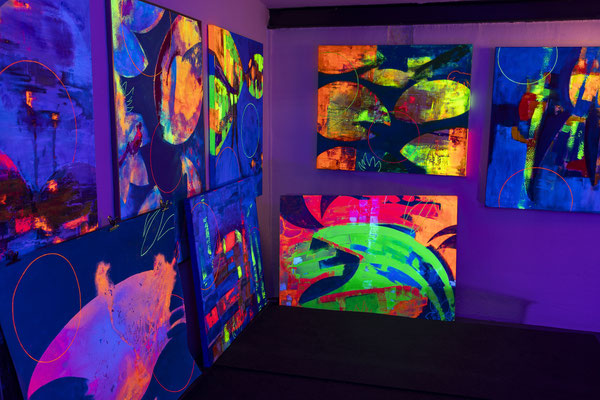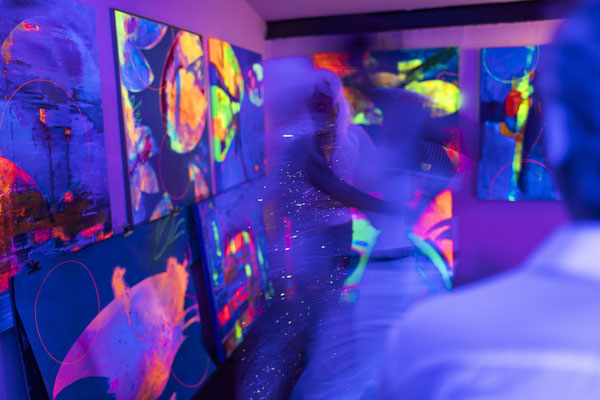 – in ultraviolett getaucht, und lebendige Kunstwerke, die magisch in fluoreszierenden Farben strahlen. Auf großen Acryl-Leinwänden tummeln sich bunte Fische und zauberhafte Meerestiere. Funkelnde